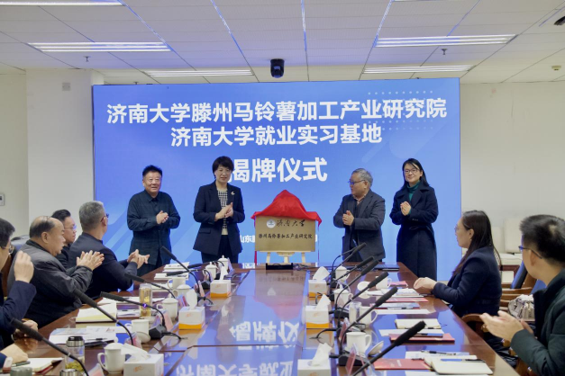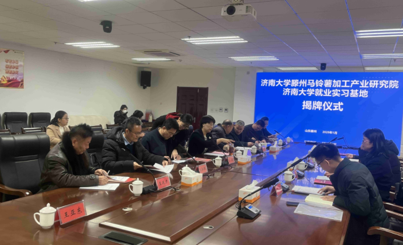 2025年1月6日上午,济南大学滕州马铃薯加工产业研究院揭牌仪式在滕州市人才创新驱动中心举行。济南大学生物科学与技术学院名誉院长徐会连、济南大学生物科学与技术学院院长秦晓春、滕州市副市长刘琳、省供销社合作指导处原一级调研员段云,市科学技术局党组书记、局长刘建,市科学技术局党组成员、市人才创新驱动中心主任朱辉,市农业农村局党组成员、市农业技术推广中心主任孔令强,市人才创新驱动中心副主任刘浩,滕州市北大仓面粉有限公司王延力董事长及有关单位和部门出席活动。