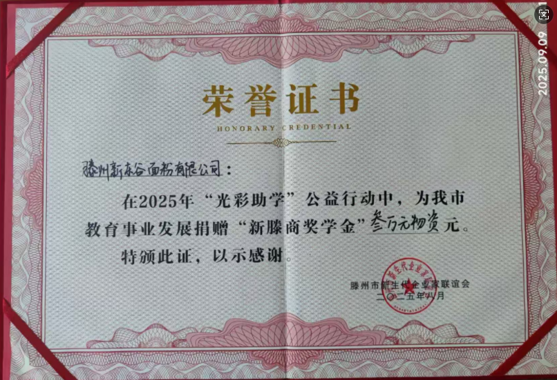 日前,滕州市新生代企业家联谊会领导,莅临新东谷面粉公司,为总经理陈加利颁发了《在2025年“光彩助学”公益活动中,为我市教育事业发展捐赠“新滕商奖学金”叁万元物资》荣誉证书。以资鼓励和感谢新东谷面粉公司对教育事业奉献的爱心和善举。